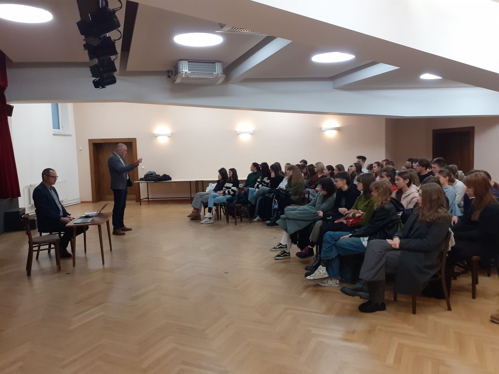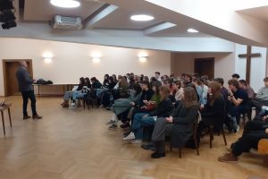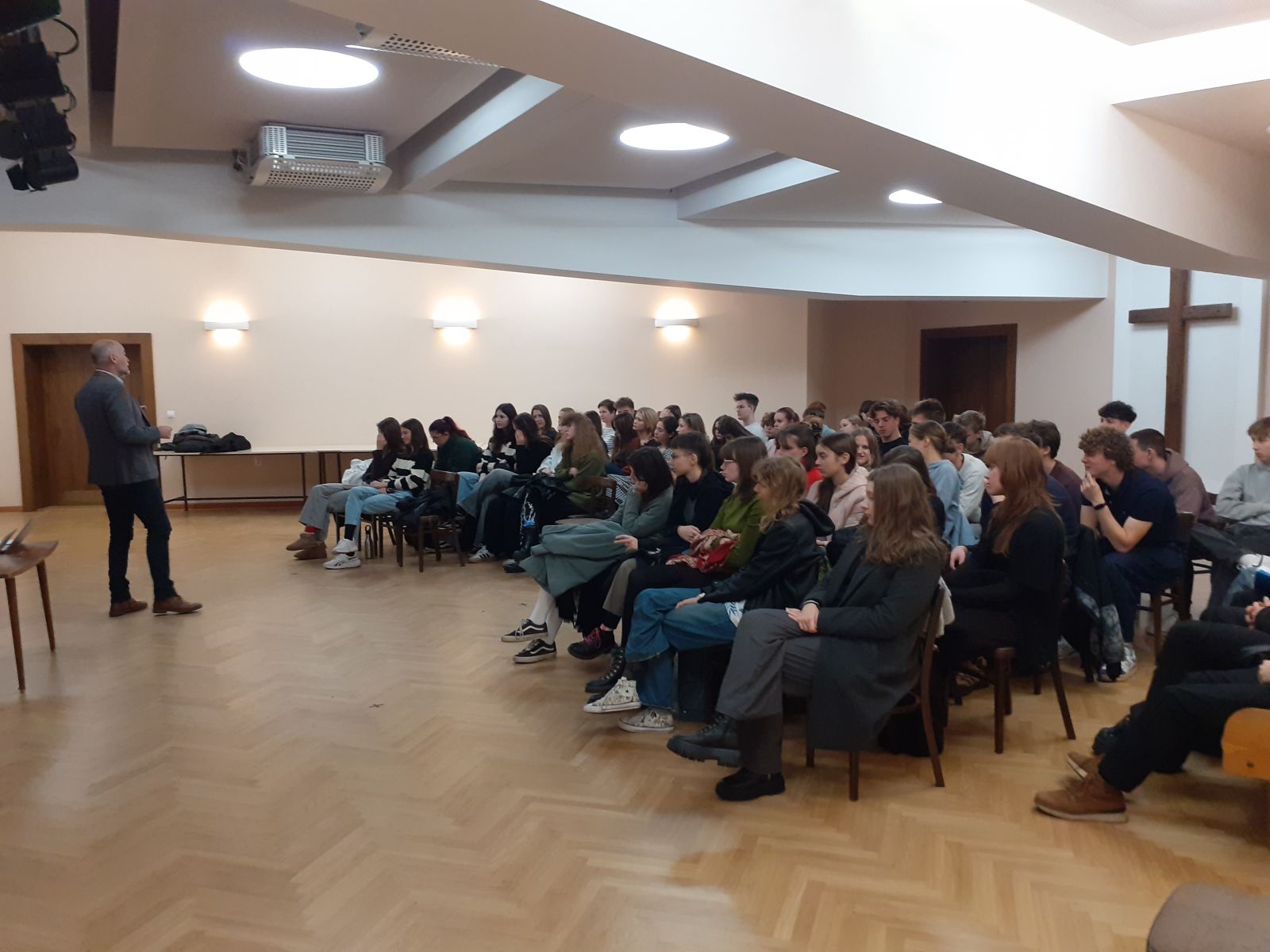 V pondělí 1. prosince studenti 3.A a 7.C v rámci tématu práva a orgánů právní ochrany v ČR zavítali do nedalekých kulturních a přednáškových prostor kostela sv. Václava a sv. Anežky České, a to na besedu s Janem Slaným, okresním státním zástupcem, a Tomášem Foldynou, prezidentem unie státních zástupců. Besedu otevřelo téma teorie a smyslu práva, hosté ovšem studentům představili i něco z práce státního zástupce a druhou polovinu besedy se debatovalo o trestné činnosti v kyberprostoru.