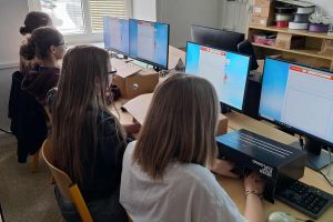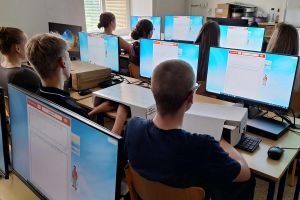 V rámci nového předmětu Finančnictví a psaní na PC se naši gymnazisté učí psát všemi deseti - skvělá dovednost pro život i studium. Při nácviku používají krabice přes klávesnici, které jim brání dívat se na prsty. Přejeme jim málo chyb a rychlé, hbité prsty!