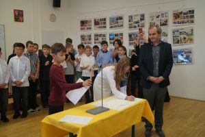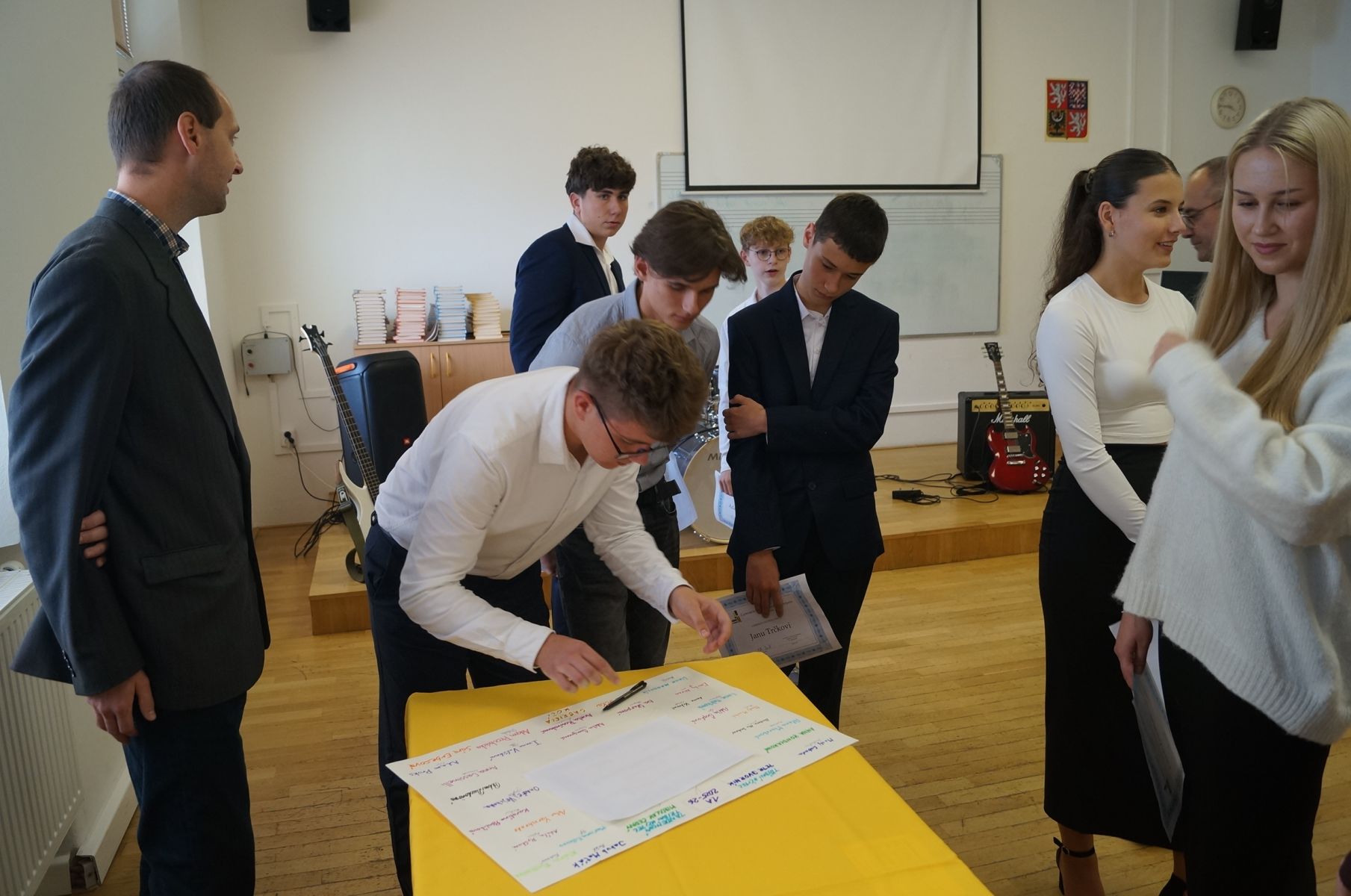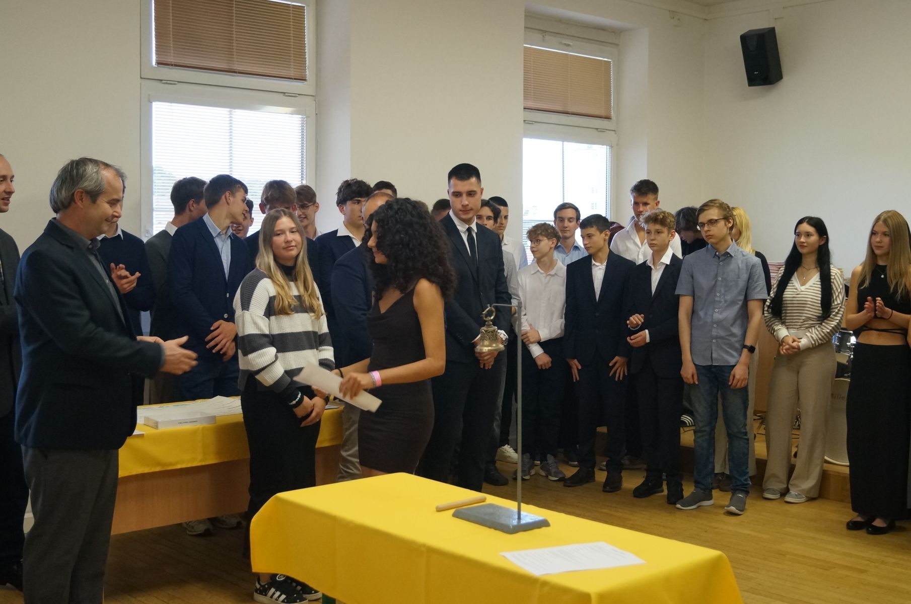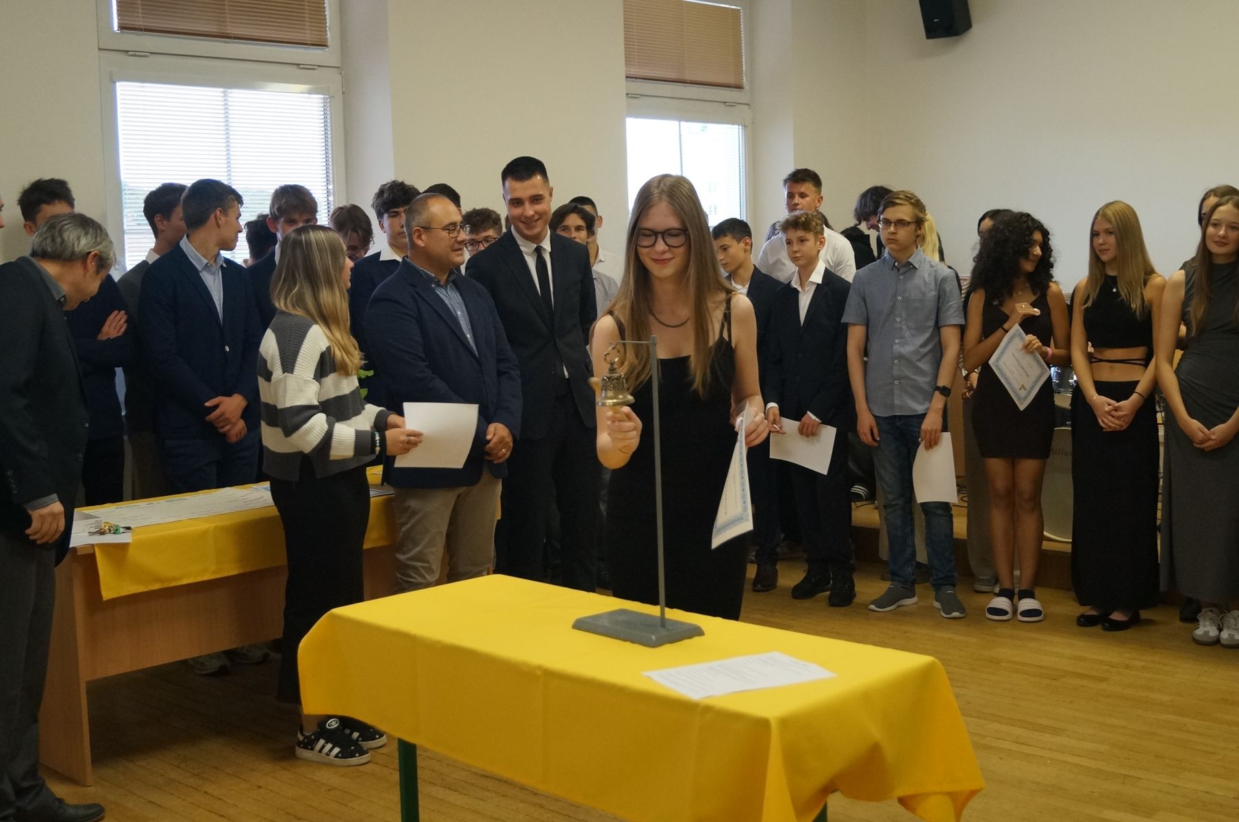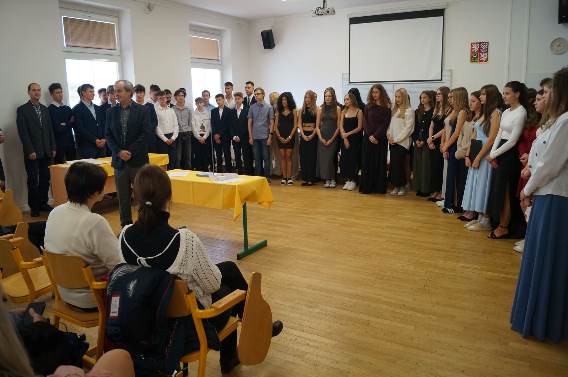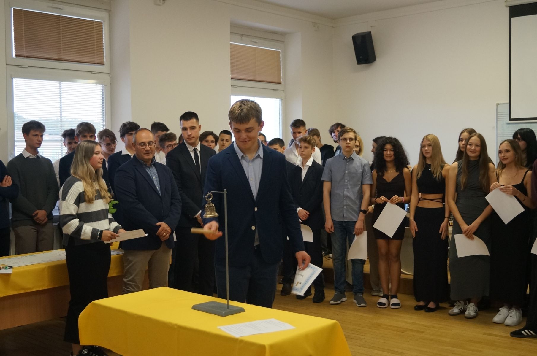 Na všechny žáky nových tříd čekala v úterý 7. října nově zavedená společenská událost – imatrikulace. Během tohoto obřadu byli slavnostně všichni přivítání na gymnáziu, zapsali se do listin a svá studiu zahájili symbolickým zazvoněním na historický zvonek. Pro žáky i jejich rodiče to určitě byl příjemný prožitek, na který budou rádi vzpomínat.
