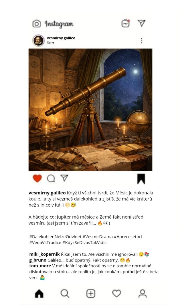 V příspěvku nesměly chybět ani hashtagy a 3 komentáře jiných historických osobností.