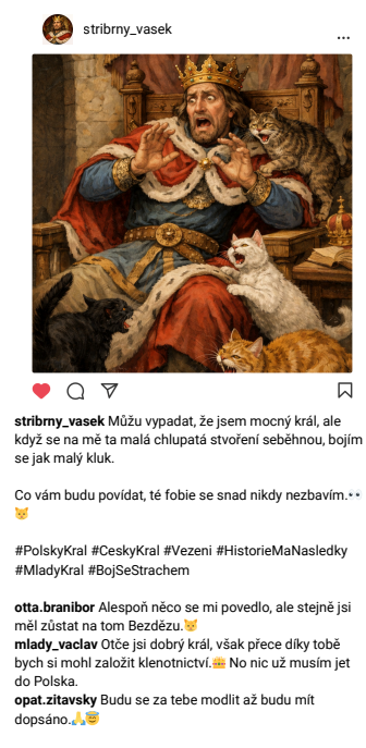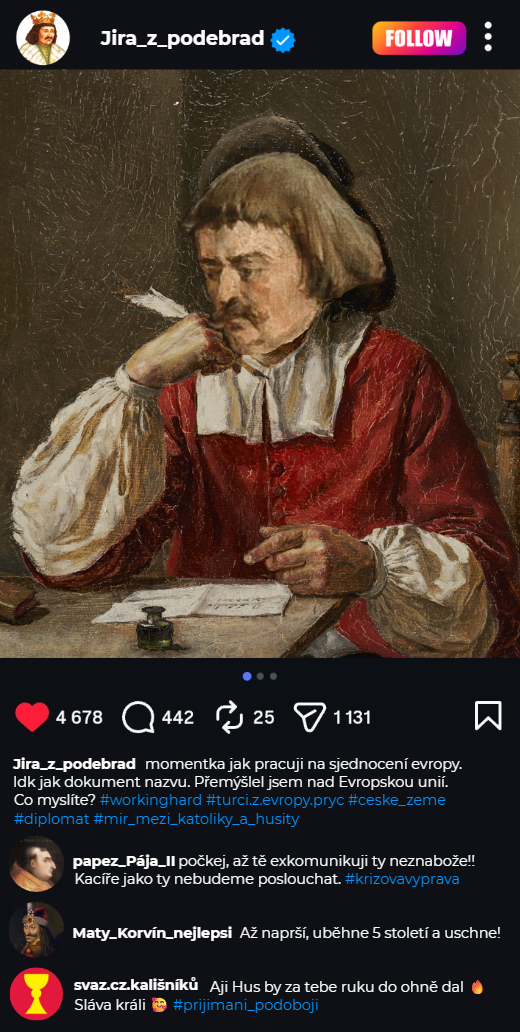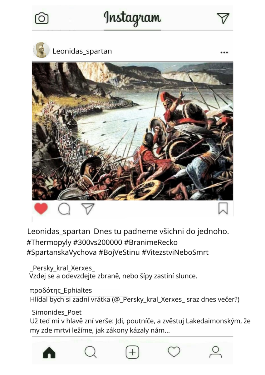 Na měsíc únor dostali studenti sexty v hodinách dějepisu kreativní úkol: vybrat si libovolnou probíranou historickou postavu, jménem které měli vytvořit instagramový příspěvek vztahující se k jejich životu.