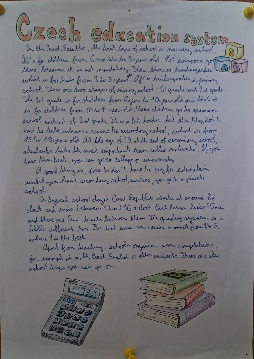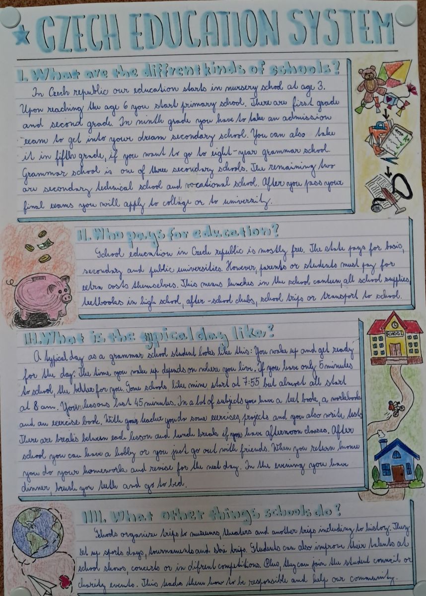 Žáci kvarty se v hodinách angličtiny seznámili se vzdělávacím systémem v USA a poté každý student vypracoval vlastní projekt zaměřený na vzdělávací systém v České republice. Některé práce byly velmi zdařilé a svým obsahem se vyrovnají maturitní přípravě.